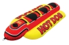 You'll have the time of your life on this "water weenie" designed for 1 to 3 riders. Hot Dog has deluxe nylon-wrapped handles with neoprene knuckle guards. There are three neoprene seat pads for comfort and to help you stay on top. It's a whopping 8-1/2' long x 44" wide. Rope hook-ups are super easy with a heavy-duty Kwik-Connect. Three 30-gauge vinyl air chambers are fully encased by a double stitched 840-denier nylon cover. Equipped with an Airhead Multi-Valve for the ultimate in inflating and deflating convenience.