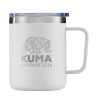 Travel mug is vacuum sealed and features double wall stainless steel. Holds 12 ounces of liquid. Includes a lid. Powder coated. White.
